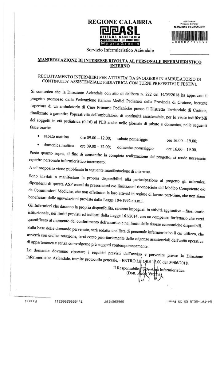 Reclutamento infermieri per attività da svolgere in ambulatorio di continuità assistenziale pediatrica con turni prefestivi e festivi