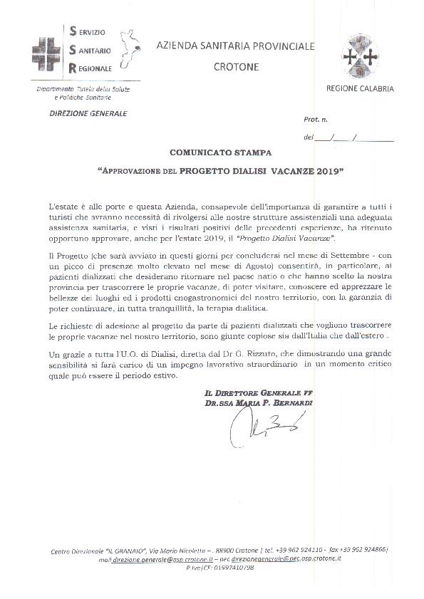 ASP Crotone-APPROVAZIONE PROGETTO "DIALISI VACANZE 2019"
