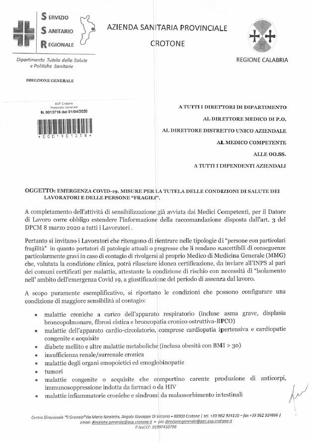 misure per la tutela della salute dei lavoratori e delle persone fragili